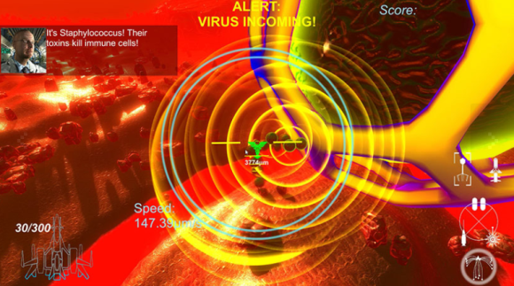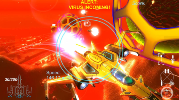在艺术化的体内环境中自由飞行,袭击病原体并战斗,在广阔的鼻腔里驱逐外来入侵的细菌,或者穿过错综复杂的体液系统,抹杀四处游离的感染细胞,操控纳米战机在复杂的人体中四处探索,飞越消化系统的酸液海洋,穿过疮痍密布的炎症病灶,在免疫系统忠诚卫士的协助下,面对成倍于自身的敌人。