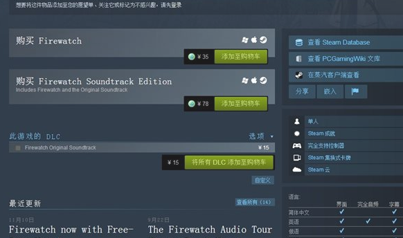 《看火人》游戏原价为68元,而现在商店价格已经变成了35元,此前的史低价格为40元。而注意到带有配乐的版本价格仍旧和此前一样是78元。