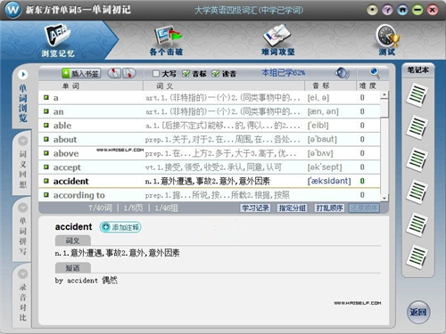 新东方背单词5白金版基本上适用于所有年龄段的用户,小学、中学、大学等等阶段全都可以使用,以科学的方式提升你对单词的记忆能力,内含海量的权威词典资源,让你享受高效率的学习方式。主界面包含选书、学习计划、单词初记、单词复习、测试与游戏、书籍管理等几大版块,词库总数超过20万词,并配有5万例句,涵盖了小学、中学、大学、研究生、新东方出国考试系列(GRE、TOEFL、GMAT及IELTS)、全国公共英语等级考试(PET1-5)、职称考试、高教自考、剑桥商务、学历文凭考试、MBA、MPA、《新概念》、《许国璋》等各种词汇。在单词记忆界面有真人发音、插入书签、添加注释、单词浏览、词义回想、录音对比等学习工具,相信这么一款轻松、娱乐的背单词软件一定会让你的单词词汇量突飞猛进。