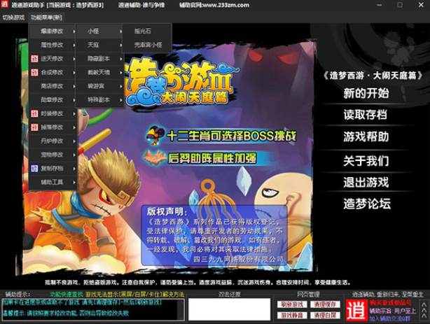 《造梦西游3逍遥修改器官网版》是专门为4339网页游戏造梦西游3所打造的最新辅助工具,在有了这款造梦西游3逍遥修改器最新版之后就可以快速的对用户游戏内容进行修改,可以使用的功能是非常的多,其中就包括了有超级bt攻击、无限刷大药、无限刷强化石等等的功能,在有了这些功能之后对于玩家的游戏会带来更多帮助,这款工具的使用方式也是非常的简单,直接点击对应功能的快捷键就可以完成功能的使用,每一位用户都是可以轻松学会。