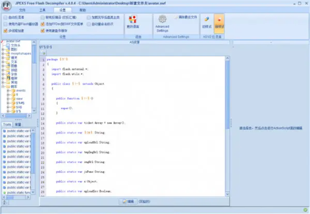 2、ActionScript 源实验直接编辑,通过汇编源代码编辑,并且支持 ActionScript1/2 和 AS3。
