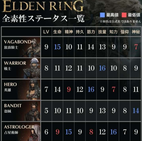 纯法系人的话,我是按完全不打算近战考虑的,所以力敏血精等全部无意义,最高蓝量与最高智力的占星师首先脱颖而出成为法师的选择。然后是同样模板的预言者,信仰与蓝条很棒,直接作为信仰施法者一选。并且在这里说一嘴,龙魔法师是吃信仰与奥术双补正的,所以预言者同时拥有着11奥术也是龙魔法的首选。最后竟然是——盗贼,主要是有高达14点的奥术,若有纯奥术流派的施法者话将作为一选,这里由于还是未知给大家看个乐呵。
