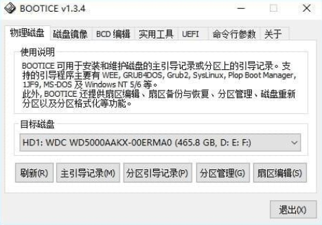 然后会带bootice主界面,保持目标磁盘不变,这次点击“分区引导记录(P)”