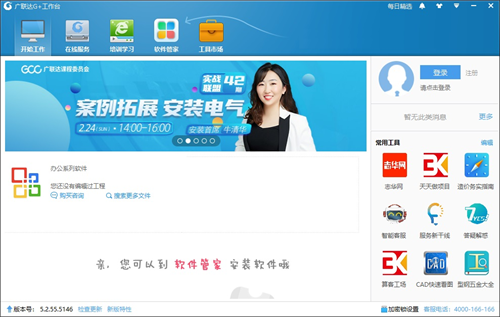 广联达g+工作台官方版将旗下的软件整理汇集到一起,用户可以十分方便地选择使用,一键安装、升级、卸载,行业资讯每天推荐给你,超多干货提升你的知识储备,工作更加有效率!广联达glodon专为用户设计的工程管理软件,汇聚广联达旗下所有产品,高效快捷帮您获取最新的产品和服务,作为一款为建筑行业从业人员量身打造的工作平台,提供全方面的使用体验。