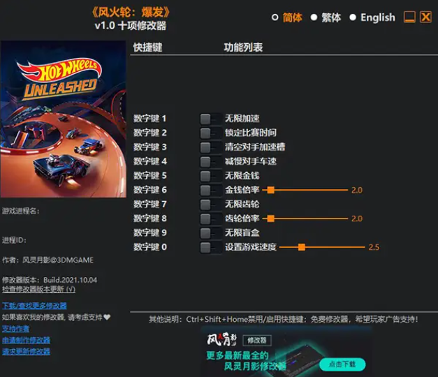 《风火轮释放修改器风灵月影版》是一款针对该游戏而制作的辅助工具,可以有效的降低游戏难度,提高游戏体验,这要得益于本修改器强大的功能,比如无限加速、无限金钱、无限齿轮、无限盲盒等,甚至游戏速度都可以由玩家自己自定义,尤其是还可以直接让对手减慢车速,清空对手的加速槽,让对手始终无法进行加速,让你处于不败之地,而风火轮释放则是一款非常紧张刺激的赛车竞速游戏,且游戏支持中文,非常符合国内玩家操作习惯。
