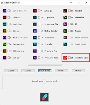 Adobe GenP界面大体分为三部分,上部为Adobe全家桶软件,可以点击选择;中间是CC2019、CC2020、CC2021、CC2022等版本选择,供自动激活使用;底部的“药丸”胶囊按钮,是开始破解按钮。