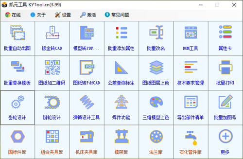 凯元工具官方版有着十多年的发展经验,专为solidworks软件打造,用户可以使用它以插件的方式方便地安装在solidworks中,支持包括批量自动出图、二维批量转换、批量打印等功能,为用户带来极大的方便。solidworks插件,主要包括批量自动出图、批量处理属性、钣金批量导cad、导出各种bom、设计齿轮链轮、标准件库等30多个功能,使用凯元插件可以有效提高solidworks设计师的工作效率。
