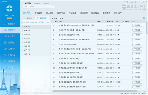 包括国家规范、地区图集、省标图集、国标图集、施工验收、注册考试、行业标准、地方法规、法规公告、图纸空间、云盘资源、专家答疑、建筑书城、商城等;专业分类包含建筑、电气、消防、结构、给排水、采暖通风、规划园林、道路桥梁、工程监理、工程造价、室内装饰、房地产、效果渲染、建筑风水、BIM、图纸等
