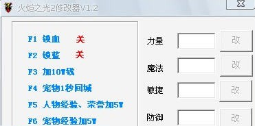 火炬之光2修改器还可以随便修改力量、魔法、敏捷、防御等人物数据的数值!在这过程中注意一点,打开修改器之前,游戏要在运行,并且是在游戏中的状态。否则修改器读不到游戏人物数据。
