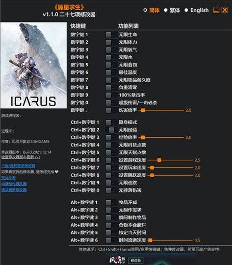 翼星求生修改器风灵月影版按键功能说明: