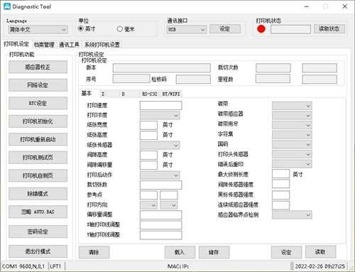 “读取”:将当前连接的打印机设置参数读入Diagtool并显示在印表机设定区