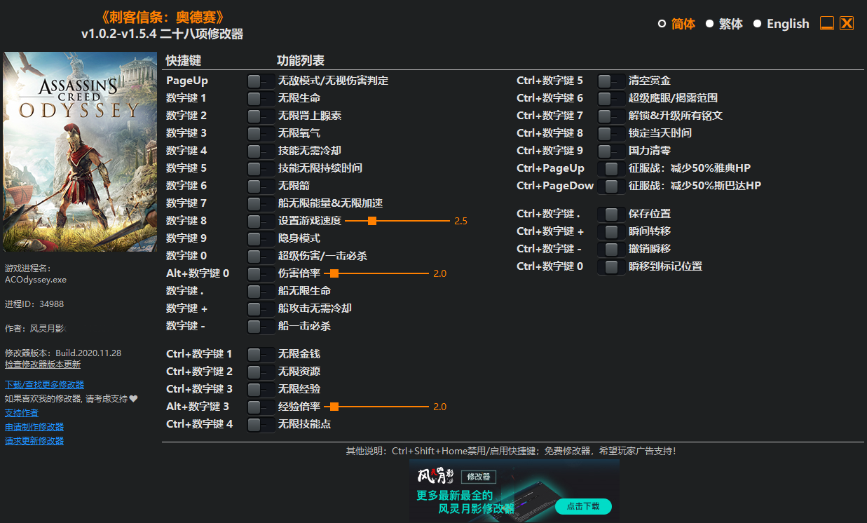 刺客信条奥德赛修改器风灵月影版功能介绍: