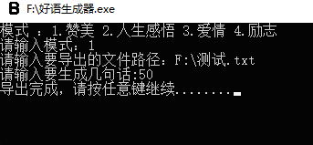 最后,就是输入要生成多少句话,输出数量我暂未测试到上限,这里暂且输入50,输出的内容会不断变化,重复概率几乎为零。