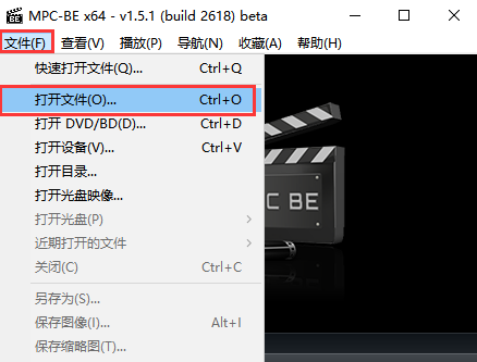 2、接下来我们点击mpc-be播放器界面上方的“文件”选项,然后在弹出的下拉框中选择“打开文件”选项,如果你的视频文件是一整个目录,那么你可以点击选项中的“打开目录”。
