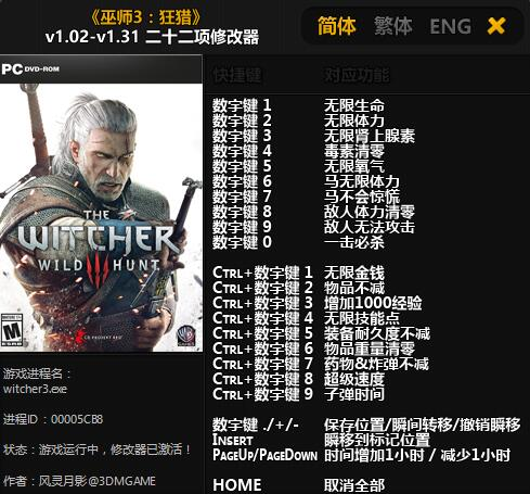 巫师3修改器1.32版是由可以修复生命力的游戏工具,巫师3狂猎二十二项修改器针对1.0到1.32的全部游戏版本,大神“风灵月影”重磅出品,具有无限生命、无限体力,相当于无敌的模式了,让玩家能够在世界中站稳,巫师3的世界中更加轻松的进行冒险。