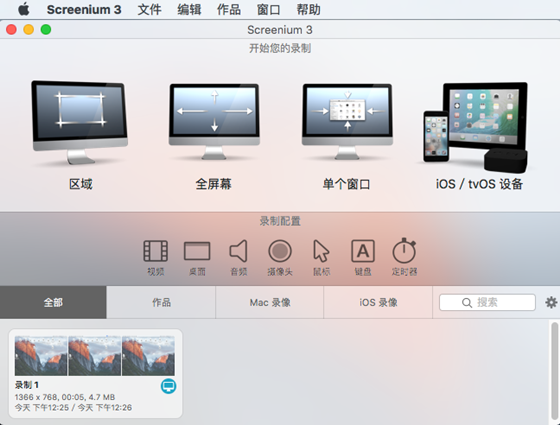 2、4 种录制模式:全屏幕、区域选择、指定窗口、iOS/tvOS设备;