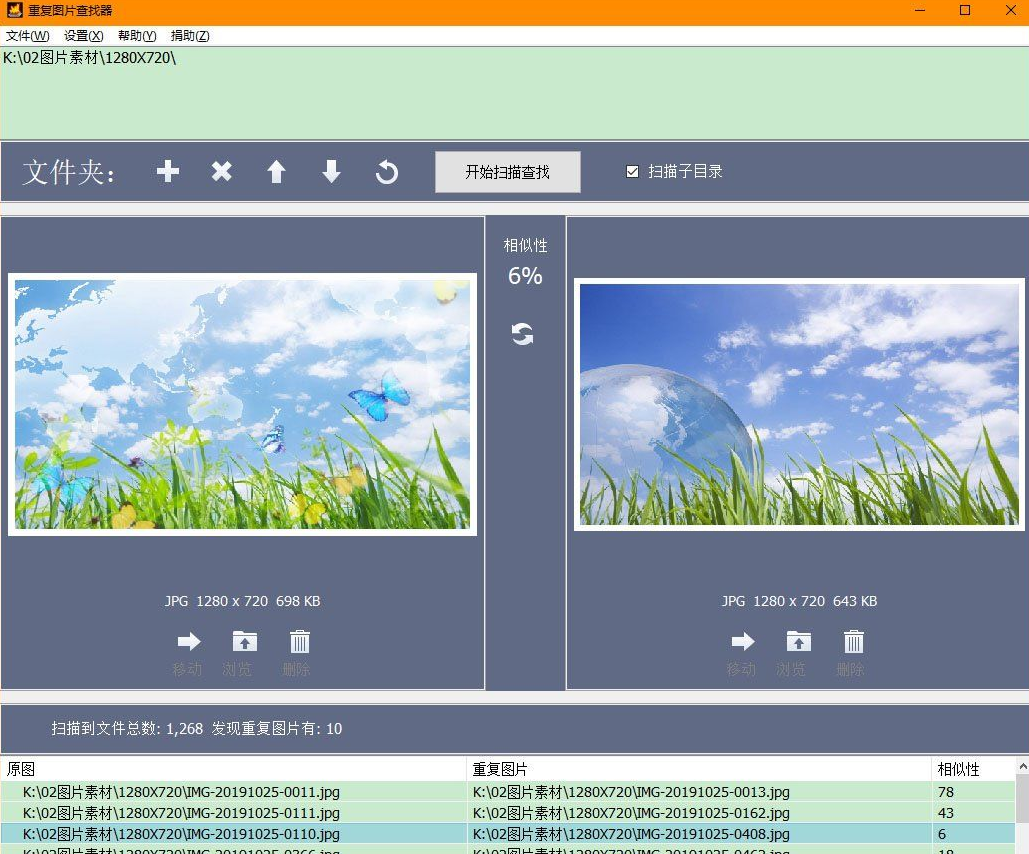 3、单击后,它将向您显示在扫描过程中发现的第一张重复图像。在图像部分之间,您可以看到在图像中找到的相似百分比。要更清晰地查看相似性,您还可以通过双击相应的重复图像来查看它们,这将在默认图像查看器中打开该图像。