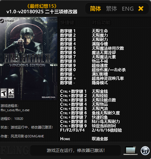 《最终幻想15修改器风灵月影版》是一款可以使用修改器来调节游戏的难度,想快速体验游戏剧情的玩家可以通过使用修改器来实现,并且修改器中带有无线生命,无线魔力,无限体力等,可以让你无敌于该款游戏最终幻想15以系列共通的新水晶神话为基础,同时展开独立的世界观、使用不同的视觉设计以及角色,游戏主人公诺克提斯·路西斯·凯拉姆是路西斯王国的王子,这个王族保护世界仅存的一颗水晶,并支配一个技术先进的城邦,游戏采用场景可无缝切入战斗的定制系统,玩家可以使用跳跃和短跳跃键发动连续攻击、与伙伴合作攻击动作,有很大自由来选择偏爱的战斗方式。