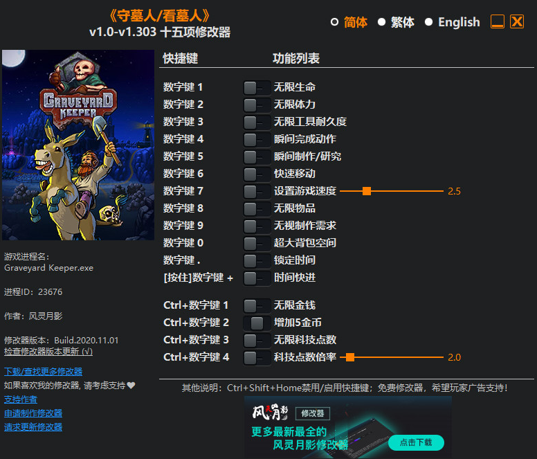 《守墓人修改器风灵月影版》是专门针对同名游戏守墓人制作的一款修改辅助工具,支持无限生命、无限体力、无限工具耐久度、无限物品、瞬间完成动作、瞬间制作/研究、超级速度 (移动速度)、超级速度 (游戏速度)等十五项辅助功能,可以帮助你更好地进行游戏,获得全新的游戏体验,并且这款游戏采用开放式地图设计,玩家需要建立和管理自己的墓地,采集资源,探索未知地牢,甚至需要伤害其他村民,想尽各种办法来壮大自己的产业,是一款非常好玩的模拟经营游戏。