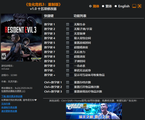 《生化危机3重制版修改器风灵月影版》是根据同名游戏所特别定做的一款游戏辅助工具,我们在游戏的过程中肯多有人会因为游戏难度太大然后一直卡关过不去,或者操作不流畅出现卡关的情况,这时候有一款修改器的话情况会好很多,我们这款修改器支持Steam正版游戏,它为广大玩家提供了无限生命、无限子弹/手雷、无后坐力、一击必杀等功能,让你不再出现卡关的情况,成为游戏中无敌的存在。