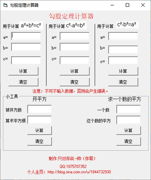 3、输入你想要的数据,然后点“计算”按钮,即可快速计算答案,若弹出报错的窗口,则表明输入的数值无法构成“勾股定理”。