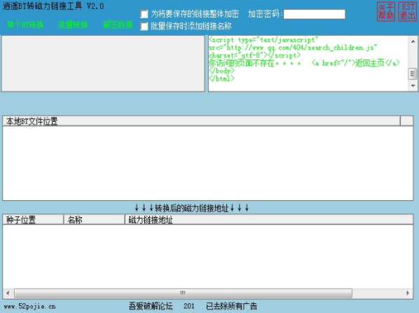 《逍遥BT转磁力链接工具免费版》是一款小巧免费的下载地址转换器,支持批量转换,用了一晚上时间清理广告,终于清理完成,与传统基于文件的位置或名称的普通链接(如Http://Xxx)不一样,它只是通过不同文件内容的Hash结果生成一个纯文本的“数字指纹”,并用它来识别文件,它类似于生活消费品包装上常见的条码,不同的是这个“数字指纹”可以被任何人从任何文件上生成,这也就注定了磁力链接不需要任何“中心机构”的支持(例如:BT Tracker服务器),且识别准确度极高。
