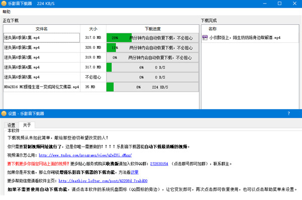 《乐影音下载器官网版》是一款个人开发的强大视频下载工具,可以免费下载几乎所有国内视频网站上的视频,能够自动下载最清晰的视频,自动合并分段视频,你只需复制视频的网址就能自动下载,它还支持优酷、土豆、腾讯视频、乐视视频、新浪视频以及搜狐视频等等视频网站,并且还可以十分轻松的帮助用户下载付费视频,通过我们的这个软件,用户们完全是可以随心所欲的免费下载自己所需要以及所喜欢的各种视频,乐影音下载器还能够自动下载十分清晰的视频,甚至还叫自动合并分段的视频。