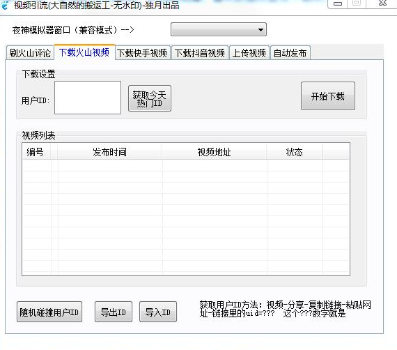 《独月视频引流软件免费版》是一款非常好用的视频引流软件,通过这款软件可以帮助用户进行短视频的引流,支持一键获取热门视频平台id,并可以查看热门id发布的视频,支持一键下载短视频,可以批量下载视频,支持火山小视频,抖音、快手等短视频平台,轻松下载热门视频,对你的视频进行引流,帮你的视频作品引来大量的流量,视频播放量大大增加,支持刷火山评论,刷火山视频的评论,读取评论,循环为视频刷评论,让视频获得大量的人气,还可以刷关注,无水印下载视频,自动发布视频,上传视频等多种功能,快来下载体验吧。