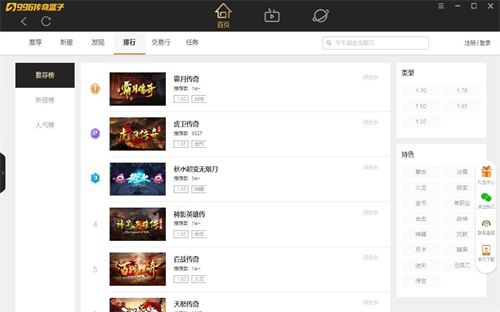 996传奇盒子官方版里面有着超多好玩的游戏等你体验,不管是新游榜还是热游榜你都可以在这里找到你想要体验的传奇,让你重新体验到当年砍传奇的快乐,并且现在的画质相较于当年可谓是飞一般的提升!一款为玩家们提供大量传奇游戏的平台游戏过程中不会出现闪退、黑屏以及弹窗广告等模式了,还为玩家带来了开放透明的交易平台,而且996传奇盒子电脑版里面的传奇数据都是三端互通的,极致的游戏画面以及多重战斗玩法点燃你的热血!