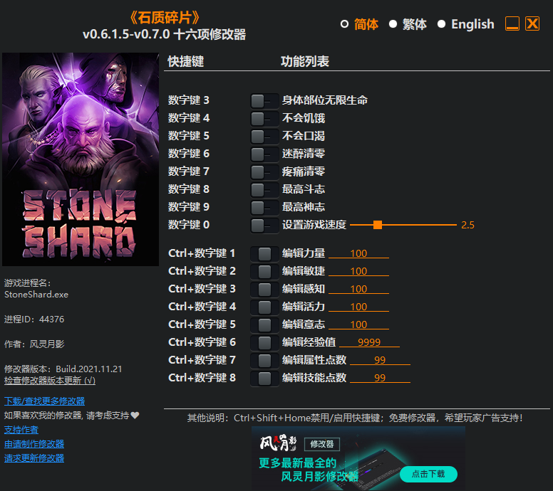 3、接着就是运行石质碎片修改器3dm版,按照上面的按键功能,就是相对应的功能;