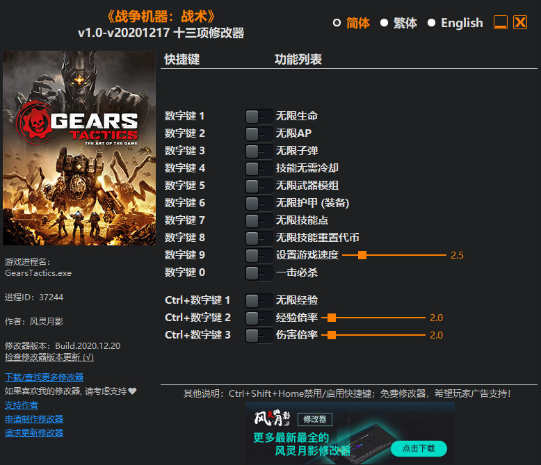 战争机器战术修改器风灵月影版功能说明: