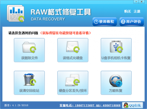 1、打开安装好的raw格式修复工具,从界面上的6个功能中选择需要的功能,比如我们选择“误删除文件”恢复。
