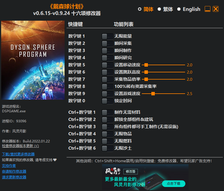 《戴森球计划修改器风灵月影版》是一款功能种类繁多的游戏修改工具,能够帮助玩家轻松修改游戏中各种游戏数值,让玩家简单快速通过游戏关卡,软件提供了机甲、能量、速度、制作等十三项修改功能,满足众多玩家在游戏中的各种需求,戴森球计划是一款科幻元素的养成游戏,该游戏结合了超多科幻元素风,包括外太空、自动工厂等冒险科幻玩法,玩家不仅可以打造一座自动化无人工厂,还可以探索星球中各种有利的生活资源,玩家可以在游戏中体验到各种玩法。