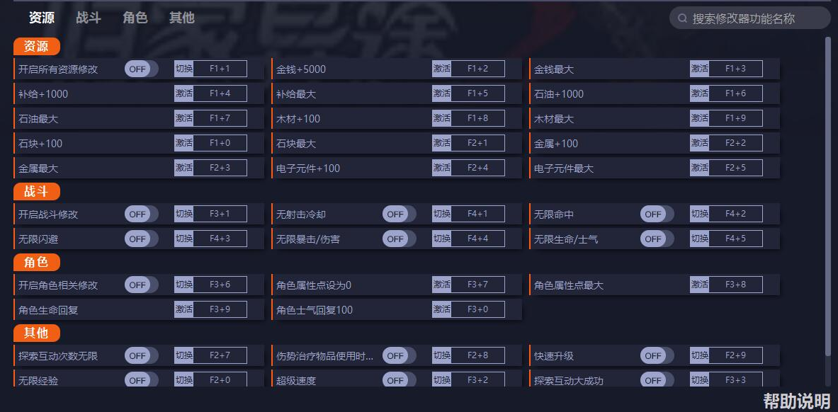3、开启修改器各主初始项再使用各子修改项[无主初始项则不用开启][主初始项:如开启...修改]。
