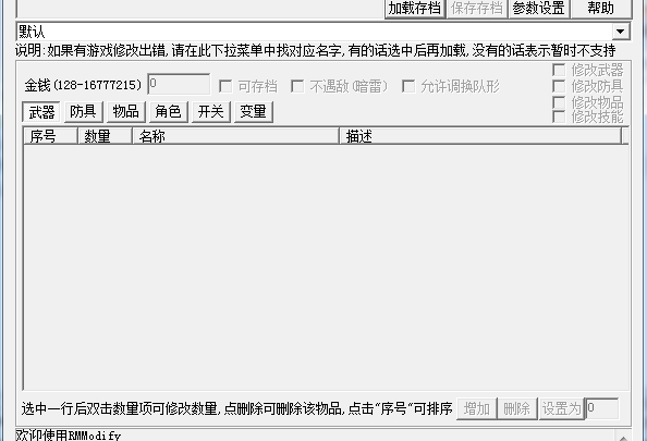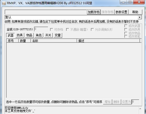 RMModify游戏修改器有着最简单的使用方式,只要将游戏存档导入在这里,点击读取,上面有着多种修改选项,让你的游戏存档数据轻松改写。能够修改龙头图标的RPG游戏的存档,添加金钱、武器,调整物品数量等,也可调整角色等级、HP、MP、经验,学会新技能。除此之外,还可以调整游戏进度,打开未解锁的关卡,功能多多。