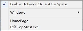 Window TopMost Control运行后会显示在系统托盘中,它没有设置,也没有任何界面,功能都是使用系统托盘图标的菜单来实现。