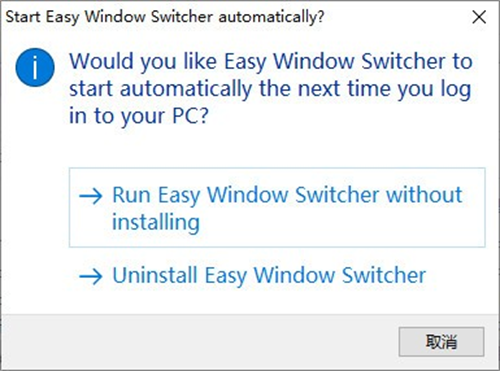 运行 Easy Windows Switcher 后会出现两个选项,第一个选项是「Automatically start Easy Windows Switcher」,点击这个选项后会进行后台的注册,让它随系统启动而启动。第二个选项是「Run Easy Window Switcher without installing」,这个是不安装直接运行,选择的结果就是每次开机后都要手动执行运行。
