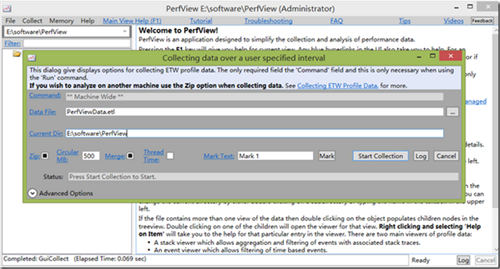 PerfView利用Windows事件追踪,而ETW从Windows 2000 Server以来就一直内置于操作系统中。只是最近才有XPerf和PerfView一类的工具利用ETW数据来解决性能问题。事件数据被收集到一个事件跟踪日志(ETL)中。根据你想要跟踪事件的数量和时间的长度,ETL文件可能会非常大。你可以限制这个日志文件的大小,如果空间受限或者你不知道问题何时发生的话,你还可以让它们循环。默认每毫秒一次的采样间隔在收集时间内产生了大概百分之十的CPU开支。建议大概5000个样本(5秒)用于一次代表性配置采样。