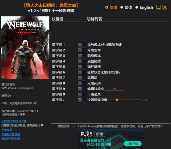 狼人之末日怒吼地灵之血十一项修改器风灵月影版使用描述: