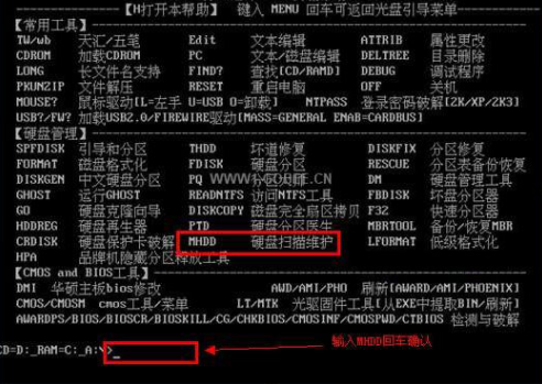 2、部分系统盘可能不一样,但是几乎找一下都会有MHDD硬盘扫描维护这个的,输入MHDD回车确认,这个mhdd不区别大小写。即可进入MHDD扫描工具的使用。
