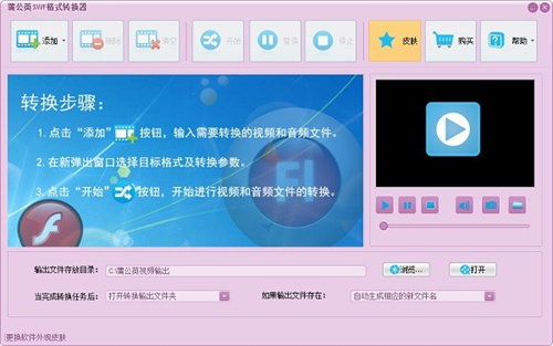 软件还有一个独特的功能,支持音频的SWF或FLV格式转换,比如您可以将MP3转换为SWF或FLV音频格式,或者将WMA、WAV、OGG等各种音频格式转换为SWF或FLV格式的音频。支持批量转换、转换完成后自动关机等功能,支持更换软件皮肤。