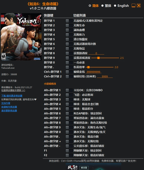 如龙6生命诗篇二十八项修改器风灵月影版功能描述: