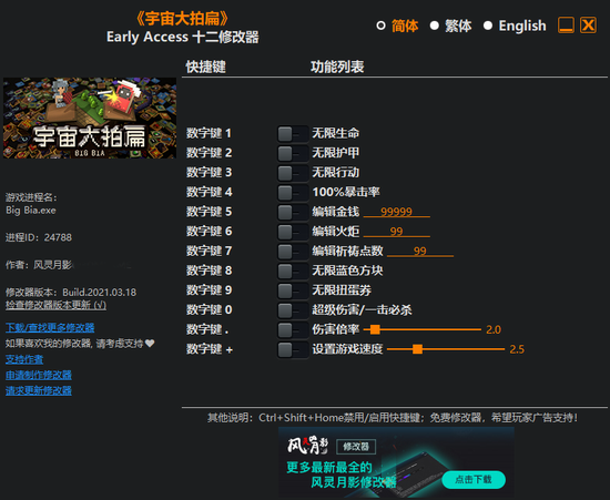 《宇宙大拍扁十二项修改器风灵月影版》是由风灵月影推出的一款功能强大的专业游戏辅助工具,提供十二项强大的功能给玩家使用,拥有无限生命、无限护甲、无限行动、100%暴击率、无限蓝色方块、无限扭蛋券等多项变态的修改功能;除此之外,你还可以自行编辑火炬、祈祷点数以及设置游戏速度,通过使用这款修改器,能够帮助玩家在游戏中开启多项辅助操作,大大降低游戏难度,让你可以轻松的过关冒险。