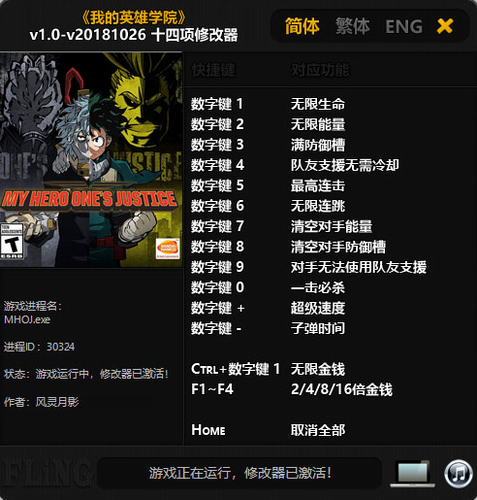 我的英雄学院十四项修改器风灵月影版按键功能介绍: