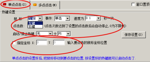 2、点击上面的单点点击选项,在下面可以进行相应的设置,比如:鼠标左键或者右键,点击次数,点击什么内容,点击频次。