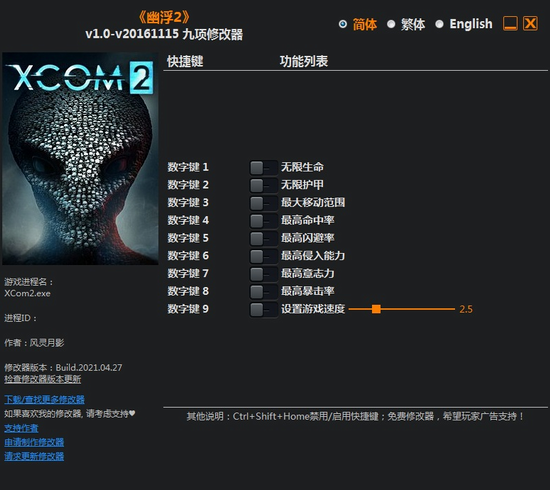 《幽浮2九项修改器风灵月影版》是一款针对同名游戏所制作的辅助工具,由风灵月影大神修改而成,为您提供了强大的九项功能,如无限生命、无限护甲、最大移动范围、最高命中率、最高闪避率、最高侵入能力、最高意志力、最高暴击率以及设置游戏速度等,极大的提高了游戏体验感,降低了游戏难度。