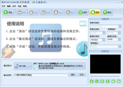 枫叶MP3/WMA格式转换器官方版是一款功能强大的视频格式转换软件,枫叶MP3/WMA格式转换器最新版采用多线程转换,支持批量转换,支持视频和音频预览,枫叶MP3/WMA格式转换器官方版支持WAV、MP3、WMA、OGG、AAC、AC3、FLAC、AMR等音频相互间任意转换。