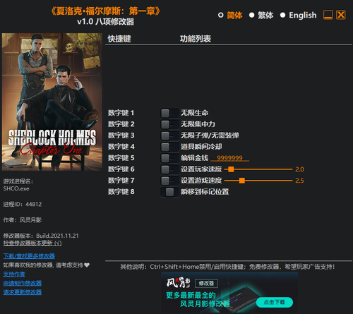 夏洛克福尔摩斯第一章八项修改器 风灵月影版软件截图