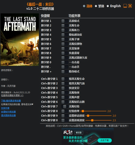 最后的战役劫后余生二十二项修改器风灵月影版键位功能描述: