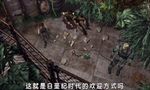 3、接著由水塔另一边的铁门来到『军事基地连络通路(1)』(※别忘了取得水塔上的回复剂),就可顺著通道来到『基地前区』的位置。进入基地前区后,会遇到霸王龙的袭击……由于此战无法取胜,因此需由地图左下的货柜处(※有扶梯可攀爬处)撤离,才能顺利进入『基地·主入口』。